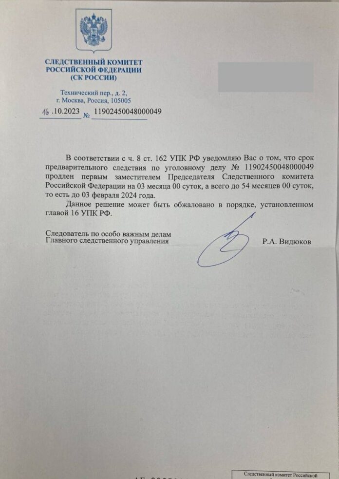 Руководитель юридического отдела Команды Навального Вячеслав Гимади опубликовал уведомление от СК о том, что срок предварительного следствия по делу об «отмывании денег» Фондом борьбы с коррупцией продлевается еще на 3 месяца.