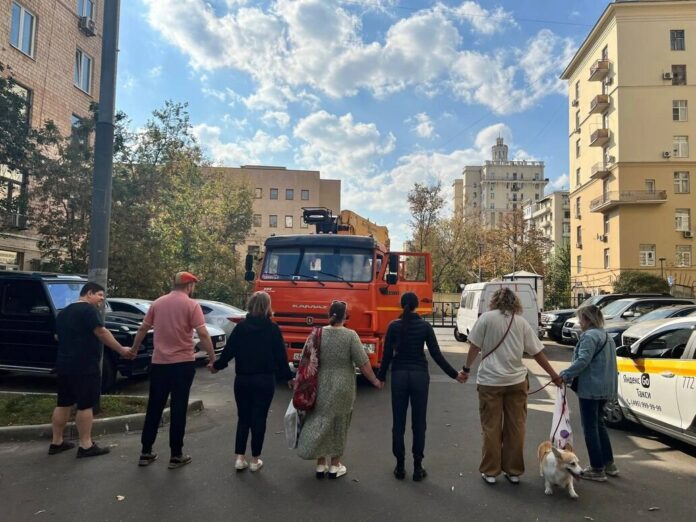 Недавно жители выстроились в живую цепь, чтобы не пропустить технику застройщика. Сегодня они вывесили из окон рястяжки со словами «Нет стройке!» и «Собянин, помоги!».
