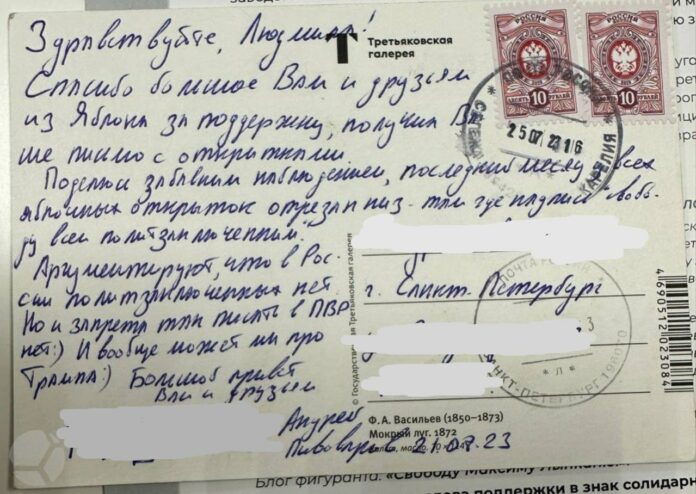 Одна из сторонниц Петербургского «Яблока», которая писала политику Андрею Пивоварову, рассказала SOTAvision, что часть ее послания не дошла до оппозиционера — открытку обрезали. Дело в том, что на обратной стороне «яблочных» открыток для политзеков напечатан лозунг «Свободу всем политзаключенным».