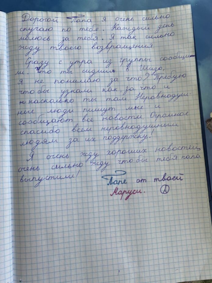 «Дорогой Папа я очень сильно скучаю по тебе. Каждый день молюсь за тебя. Я так сильно жду твоего возвращения.