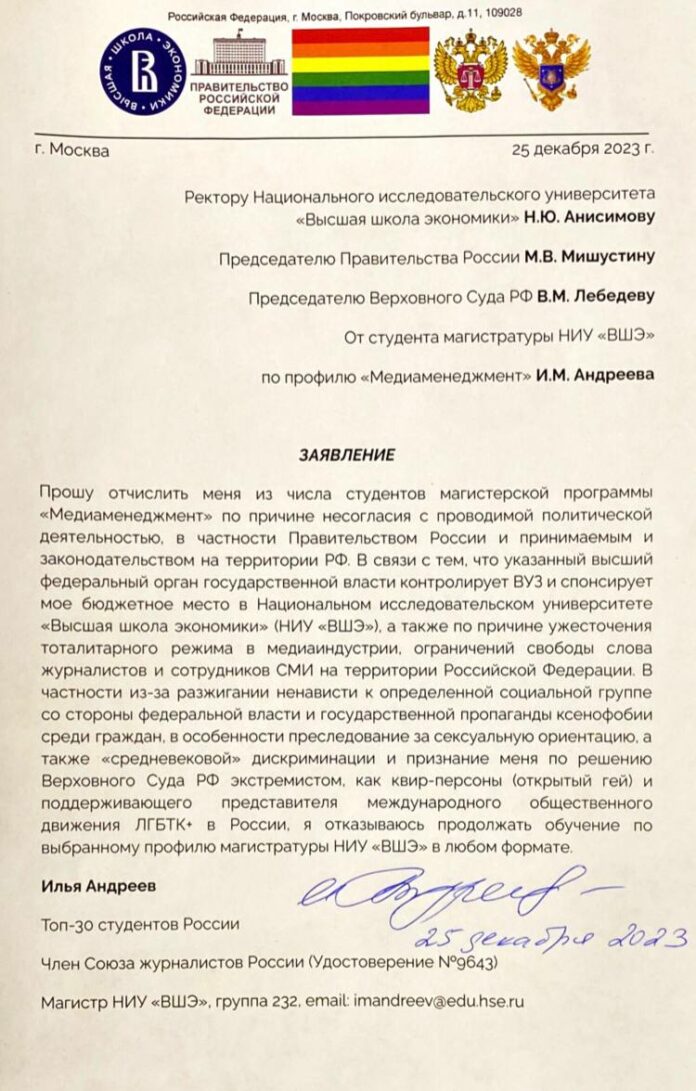 Студент магистратуры ВШЭ по медиаменеджменту, член союза журналистов РФ Илья Андреев направил заявление с просьбой об отчислении ректору вуза Никите Анисимову, а также председателю Верховного суда РФ Вячеславу Лебедеву и премьер-министру РФ Михаилу Мишустину. Текст заявления приводит издание «Гроза»: