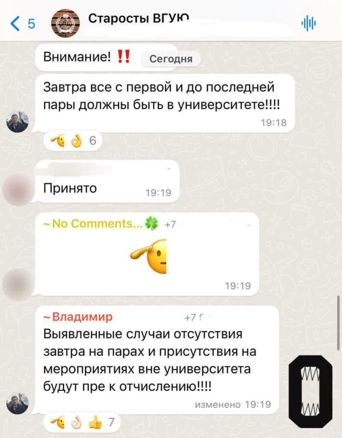 Декан одного из факультетов ВГУЮ (государственного университета юстиции) разослал в чат старост университета сообщения, где предупредил об обязательном посещении пар 1 марта, недопустимости участия в «скоплениях» в центре и Борисово и пригрозил отчислением нарушителям.