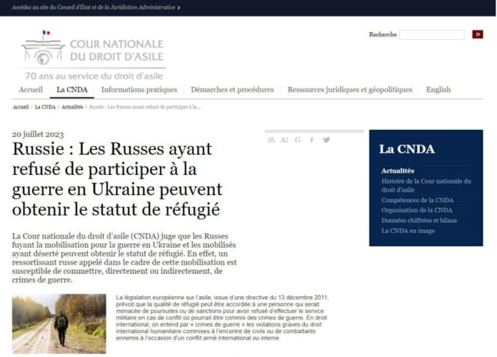 «Национальный суд по вопросам права на убежище постановил, что россияне, уклоняющиеся от мобилизации, и мобилизованные граждане, которые дезертировали, могут получить статус беженца», — сообщается в официальном заявлении на сайте суда.