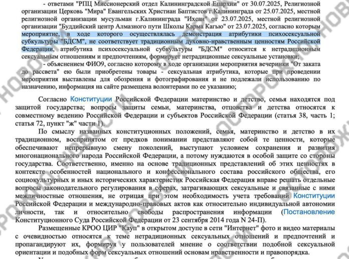 Калининградский областной суд подтвердил решение о штрафе в 1 млн рублей для центра исторической реконструкции «Кауп», признав, что БДСМ «противоречит традиционным духовно-нравственным ценностям» и формирует «нетрадиционные сексуальные установки». Об этом сообщает «Осторожно, новости» со ссылкой на полный текст судебного решения.