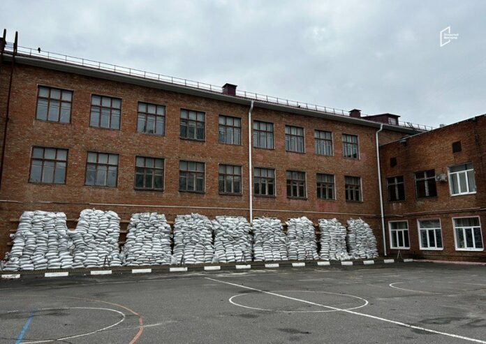 В городской школе №19 не смогли оборудовать подвал под укрытие из-за наличия там теплотрассы. Детям придется прятаться на первом этаже здания — для этого уже поставили маты и лавочки, а окна заложили мешками с песком.