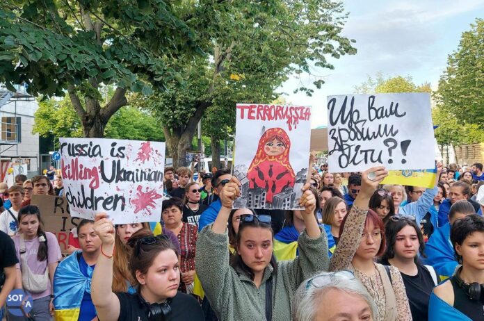 На митинге выступали украинские, немецкие и грузинские активисты. Они отметили, что Россия не знает никаких красных линий и продолжает бомбить мирных жителей, и среди них, самых слабых и молодых людей.
