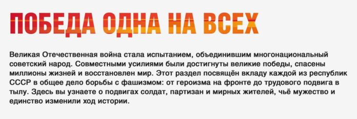 Раздел «Победа одна на всех» озаглавлен так: «Совместными усилиями были достигнуты великие победы, спасены миллионы жизней и восстановлен мир. Этот раздел посвящён вкладу каждой из республик СССР в общее дело борьбы с фашизмом: от героизма на фронте до трудового подвига в тылу».