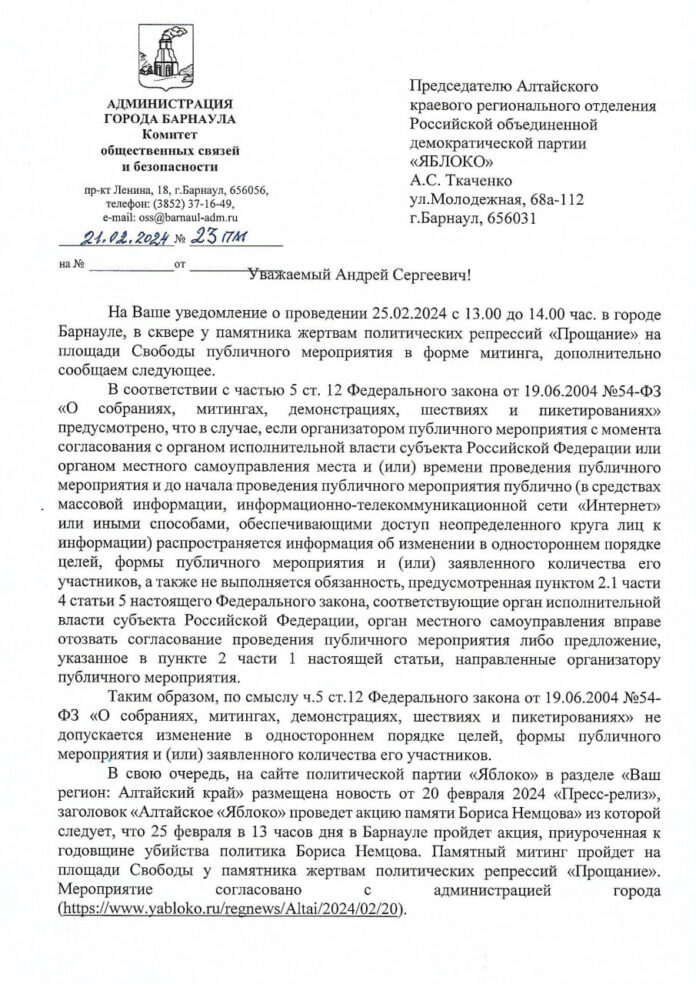 Сначала мэрия Барнаула не нашла «каких-либо факторов, препятствующих ее проведению», но затем резко отозвала согласие на проведение мероприятия.