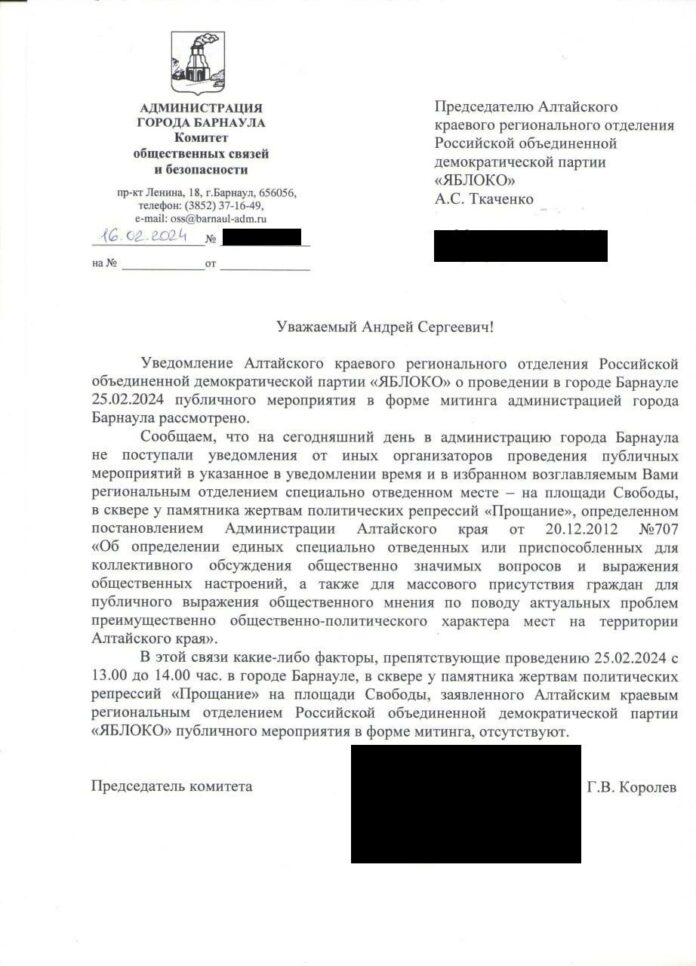 Акция состоится 25 февраля в 13:00 в сквере у памятника жертвам политических репрессий на Площади Свободы. Мэрия Барнаула не нашла «каких-либо факторов, препятствующих ее проведению», говорится в решении администрации, копию которого опубликовал «Сибирский экспресс».