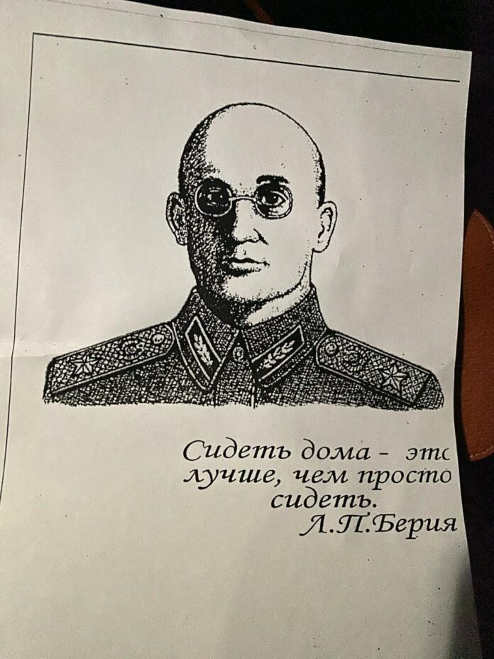 Женщину пригласили в отдел полиции после ее участия в возложении цветов к памятнику жертва политических репрессий, сообщает ОВД-Инфо. После беседы ей вручили распечатанный портрет народного комиссара внутренних дел СССР Лаврентия Берии с надписью «Сидеть дома — это лучше, чем просто сидеть».