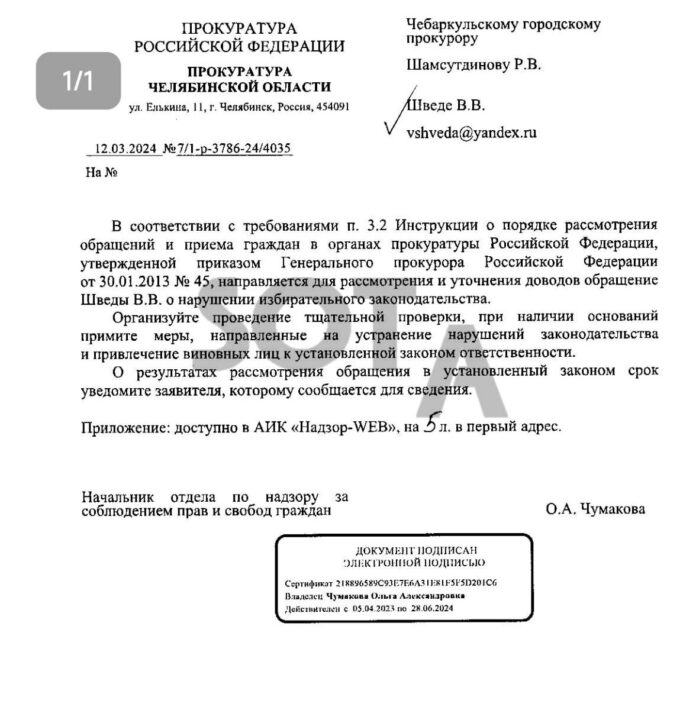 «24 января 2024 года я отправил жалобу в ЦИК на то, что Руководством Чебаркульского муниципального района осуществлялась незаконная агитация и участие в сборе подписей в поддержку кандидата Путина с использованием должностного и служебного положения. В частности, в открытом доступе с использованием официального аккаунта в социальной сети опубликована информация о ходе осуществления сбора подписей в поддержку кандидата Путина и участии учреждения в проведении деятельности по поддержке выдвижения указанного кандидата», — рассказал Шведа нашему корреспонденту.