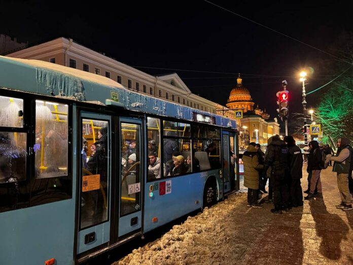 Об этом сообщает издание MR7 со ссылкой на корреспондента. Полиция задерживает предполагаемых нелегальных мигрантов и сажает в лазурные автобусы — это стандартный цвет для общественного транспорта в Санкт-Петербурге.