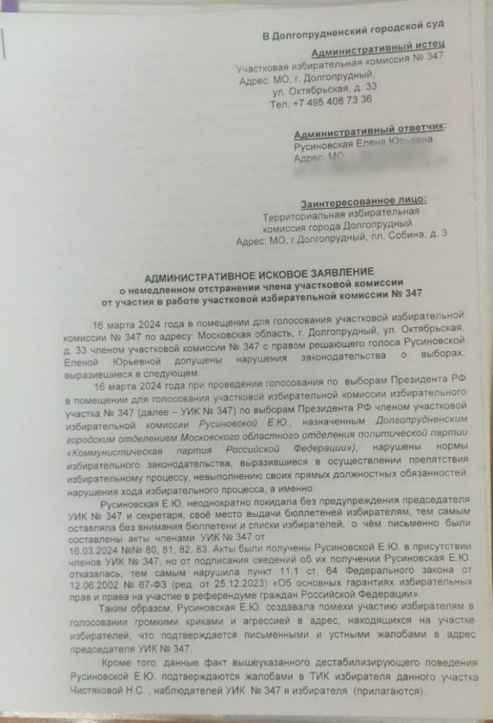 По мнению административного истца, член комиссии с правом решающего голоса Елена Русиновская неоднократно покидала место выдачи бюллетеней без предупреждения председателя и знакомила со списком избирателей местного депутата. Женщину также обвинили в «криках и агрессии» на участке.