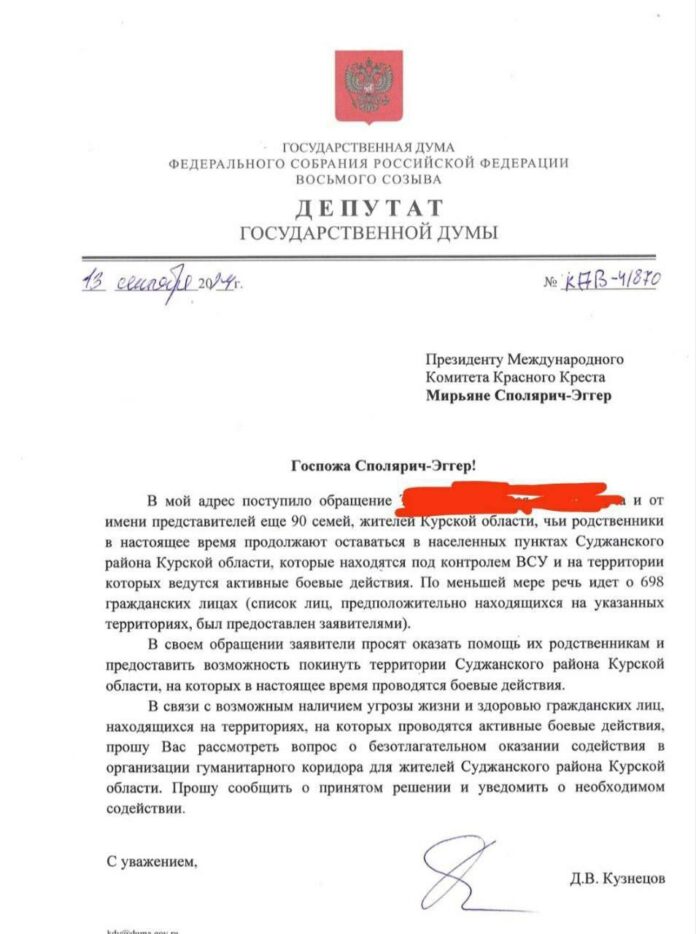 В своем обращении депутат Дмитрий Кузнецов рассказал, что к нему обратились родственники жителей населенных пунктов, контролируемых ВСУ — сейчас в зоне боевых действий остается не меньше 698 гражданских.