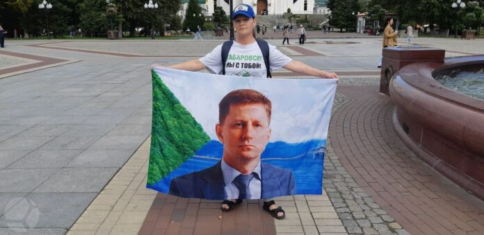 Женщина развернула на городской площади флаг в поддержку Сергея Фургала.