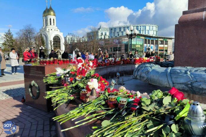 Сотни людей приходят к стеле на площадь Победы, жгут свечи, оставляют цветы и записки.