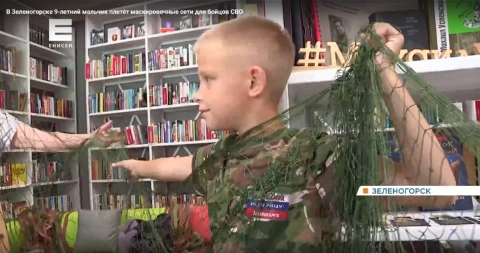 В библиотеке Зеленогорска в Красноярском крае к плетению маскировочных сетей привлекли 9-го школьника Степана. Об этом стало известно из репортажа телеканала «Енисей», в сюжете которого мальчик предстает перед зрителем в камуфляжной майке с нашивкой «ДоброVZвод». Сообщают, что ребенок работает по вечерам без выходных и мечтает служить в ВДВ.