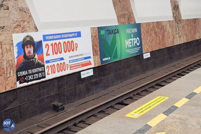 Агитацию разместили на всех станциях; на станции «Уралмаш» стоит куб и раздают листовки с призывом вступить в российскую армию.