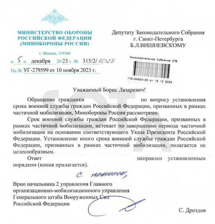 В ответе из Минобороны за подписью врио начальника 2 управления Главного организационно-мобилизационного управления Генерального штаба ВС РФ С. Дроздова говорится, что там считают нецелесообразным ограничить срок службы по мобилизации. «Частично мобилизованные», согласно ответу, будут служить до тех пор, пока мобилизация не будет завершена.