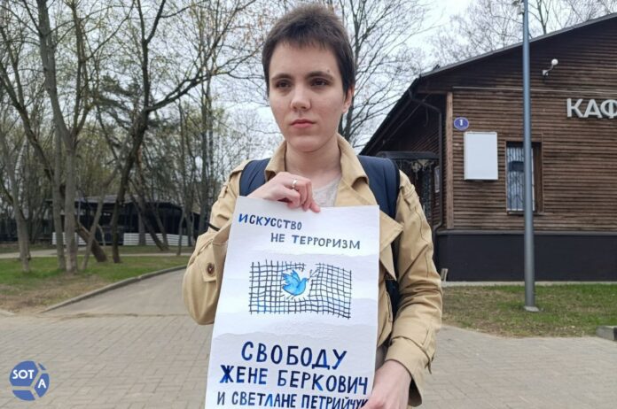Одиночный пикет прошел в парке «Кузьминки» и рядом с ним. Своей акцией активистка попыталась привлечь внимание к делу Беркович и Петрийчук, которые уже год содержатся в СИЗО. На этой неделе театралок внесли в список экстремистов и террористов.