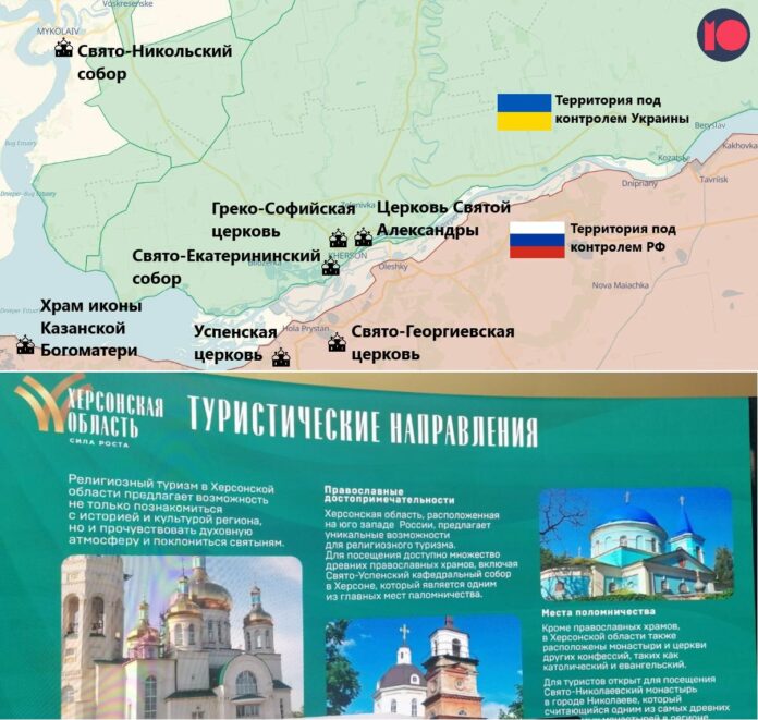 Как обратили внимание журналисты «Можем Объяснить», на стендах оккупированных регионов россиянам активно рекламируют туристические маршруты в места, на которых ведутся обстрелы. Также гостей приглашают посетить «пляжи Запорожья» или религиозные храмы Херсонской области.