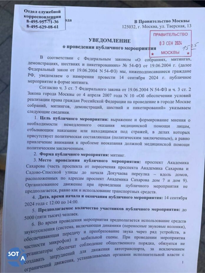 Партия «Яблоко» направила в Правительство Москвы уведомление о проведение публичного мероприятия, целью которого является «выражение и формирование мнения о необходимости немедленного оказания медицинской помощи» политическим заключенным.