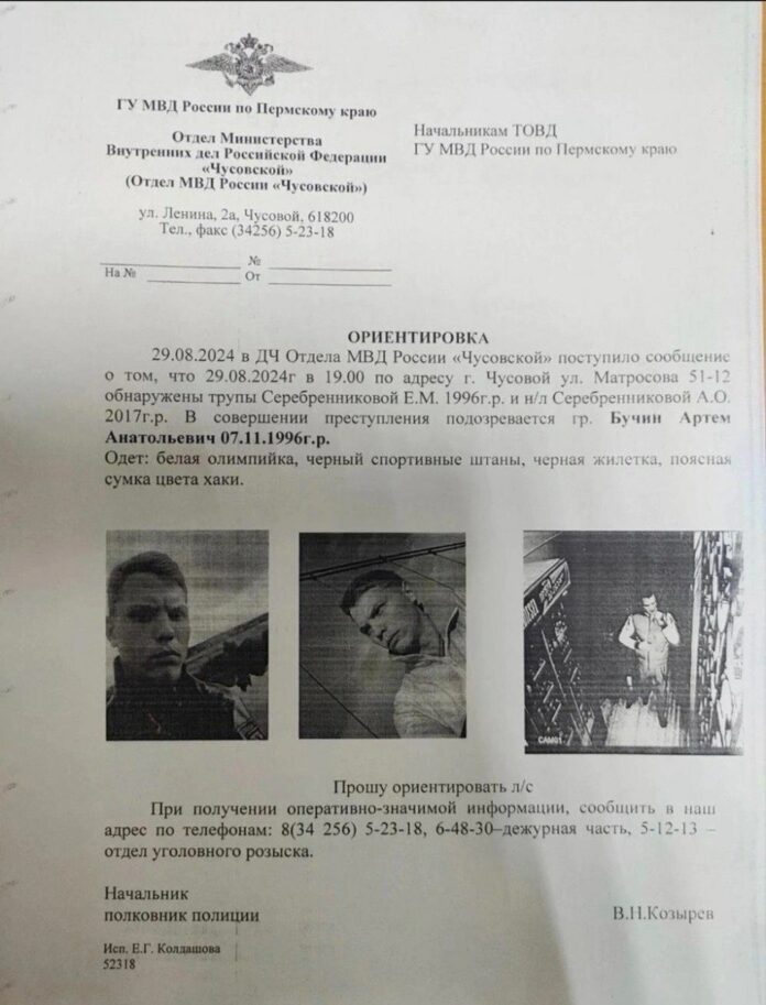 29 августа в одном из домов города Чусовой нашли два тела со следами насильственной смерти — 27-летней Екатерины Серебрянниковой и ее 7-летней дочери. МВД опубликовало ориентировку на бывшего бойца ЧВК «Вагнер» с говорящей фамилией Бучин.