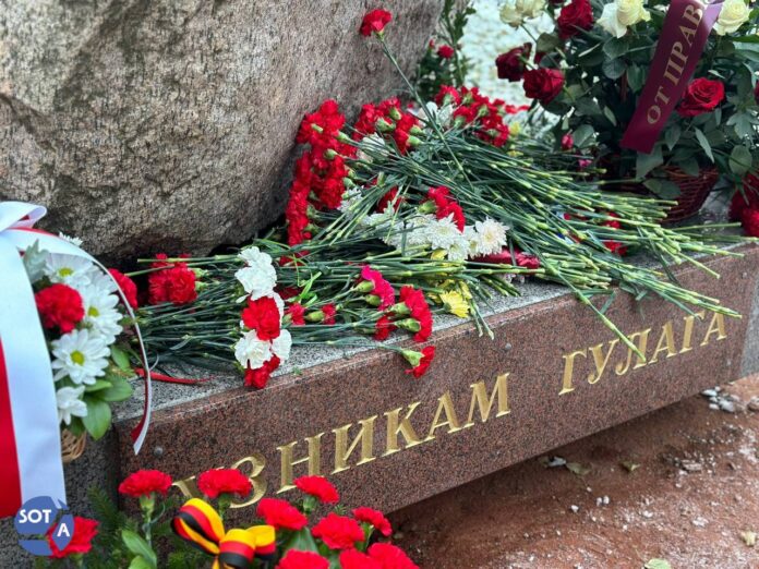 С самого утра петербуржцы несут цветы к Соловецкому камню на Троицкой площади, чтобы почтить память безвинно убитых и пострадавших в годы сталинских репрессий.