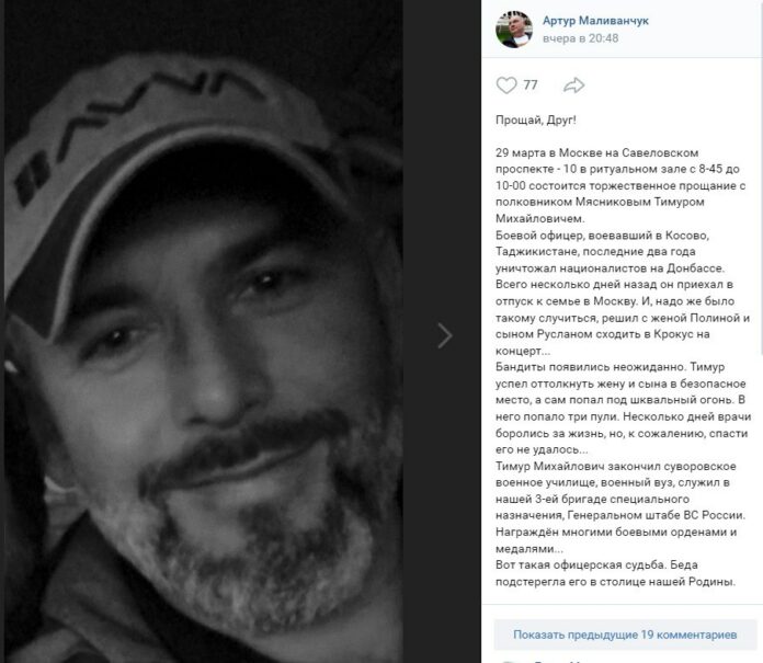 По словам Маливанчука, Мясников воевал в Косово, Таджикистане, а последние два года «уничтожал националистов на Донбассе». За несколько дней до теракта, тот приехал в отпуск с войны в Украине, чтобы встретиться с семьей.
