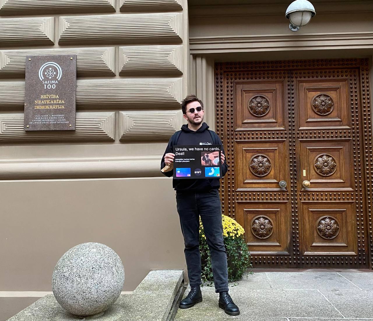 В руках у Петра был плакат с изображениями карт банков Revolut и Coop, а также логотипом криптобиржи ByBit и отсылкой к мему «Случай в казино». Он требовал «разблокировать карты уехавших из РФ граждан России, особенно тех, у кого из документов есть только гуманитарная виза».