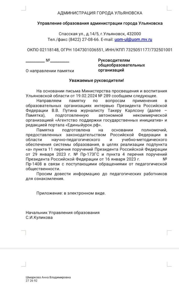 Опубликованную телеграм-каналом «Симбирский Шугожор» методичку подготовило Минпросвещения Ульяновской области. Основываясь на интервью, с помощью этой инструкции учителям предлагается организовывать для школьников дебаты и внеклассные часы. Текст интервью рекомендуется разбирать на уроках литературы и переводить на иностранные языки.