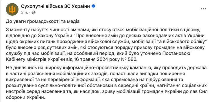 Теперь публикации с «манипулятивным толкованием» закона о мобилизации или «компрометирующей информацией» станут причиной для заведения уголовного дела. Военные напомнили, что распространение таких публикаций попадает под статью «Препятствование законной деятельности Вооруженных Сил Украины и других воинских формирований». При этом, ведомство пообещало контролировать действия сотрудников ТЦК.