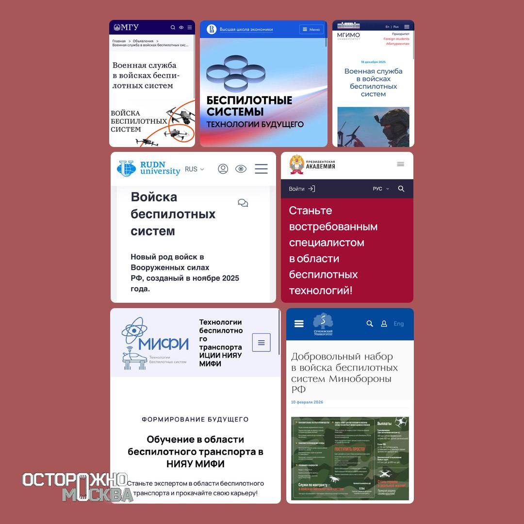 На официальных сайтах МГУ, ВШЭ, МГИМО, РУДН, РАНХиГС, МИФИ, МГМУ (Сеченовский), РЭУ (Плеханова), МИСИС, МИРЭА, РГУ, МАИ, РГГУ, РГСУ и многих других московских университетов появились агитматериалы к заключению военных контрактов, обратил внимание канал «Осторожно, Москва».