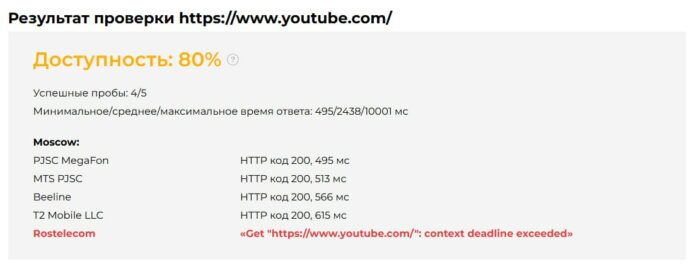 СМИ начали сообщать о возвращении доступа к YouTube, однако сервис GlobalCheck сейчас показывает, что на территории России платформа доступна на 80%. Проблемы наблюдаются преимущественно у тех, кто подключен к Ростелекому.