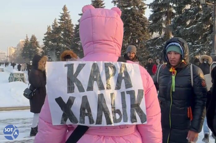 Надпись «Кара Халык» на спине активистки отсылает к фразе, за которую осудили Фаиля Алсынова. Его сторонники переводят словосочетание как «черный люд» или «простой народ».