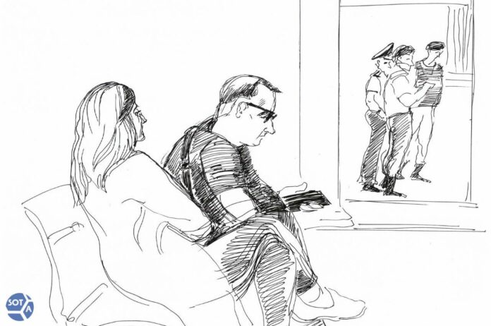 На эскизах изображены выступления подсудимых с последним словом и их реакции на запрос срока.