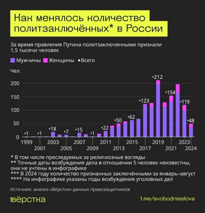 Вплоть до полномасштабного вторжения России в Украину доля женщин среди политзаключенных не превышала 15%. В 2022 году женщины составили уже 16% от числа фигурантов политических уголовных дел, в 2023 году — 18%, а за неполный 2024-й их число выросло до 27%.